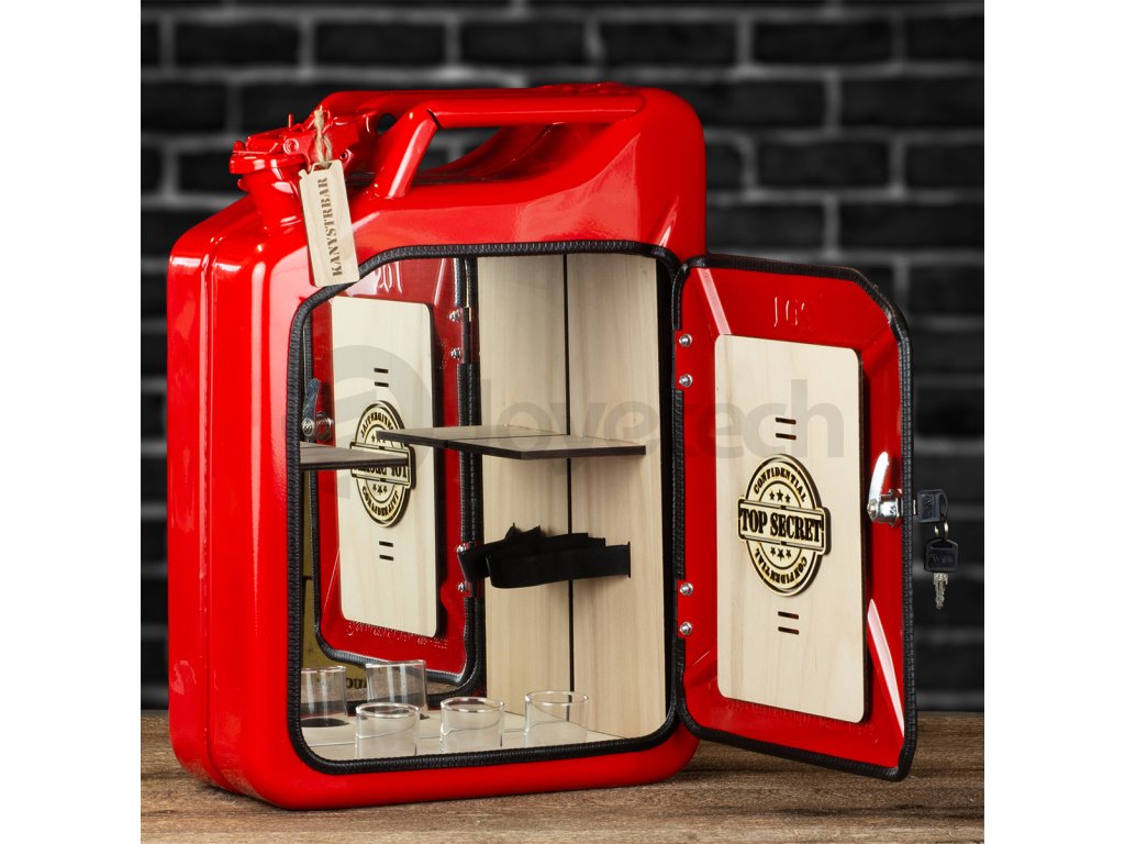 Bar Kanystr není jen atrapa, ale designový doplněk pro pořádného chlapa vyrobený z opravdového kanystru. Díky různým originálním provedením v něm naleznete ten nejlepší dárek, ať už slaví dědeček, tatínek nebo třeba přítel. Díky propracovaným poličkám a přihrádkám se v něm schová vše důležité včetně lahve něčeho ostřejšího. Stačí si jen vybrat, který bude ten pravý.