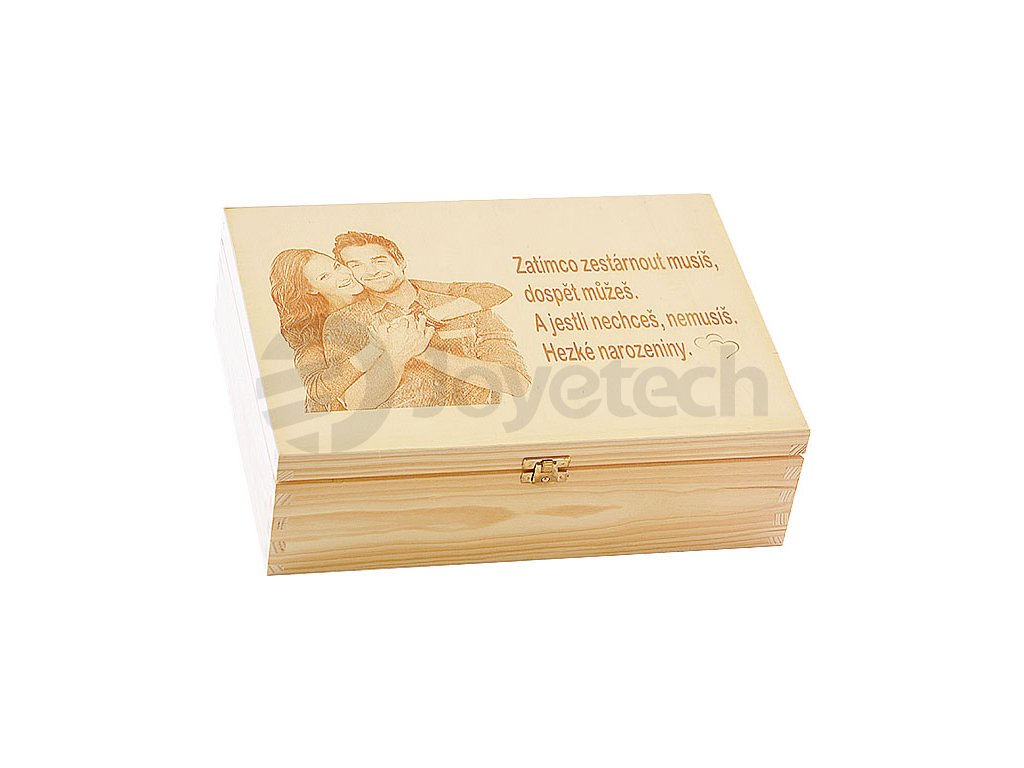 Originální dárková truhla nabízí možnost jedinečným způsobem vyjádřit úctu a poděkování Vašim blízkým a firemním partnerům. Dárková truhla poskytuje jedinečný prostor pro blahopřání, vzkaz, firemní logo, či obrázek. Buďte kreativní a připravte obdarovanému jedinečné překvapení. Vytvořte originál, který nemá nikdo jiný na světě! Prostě parádní kousek. Vaše nápady rádi laserem vygravírujeme na víko poctivého boxu zhotoveného z borovicového dřeva a překližky, nebo vytiskneme a umístíme na vnitřní stranu víka.
