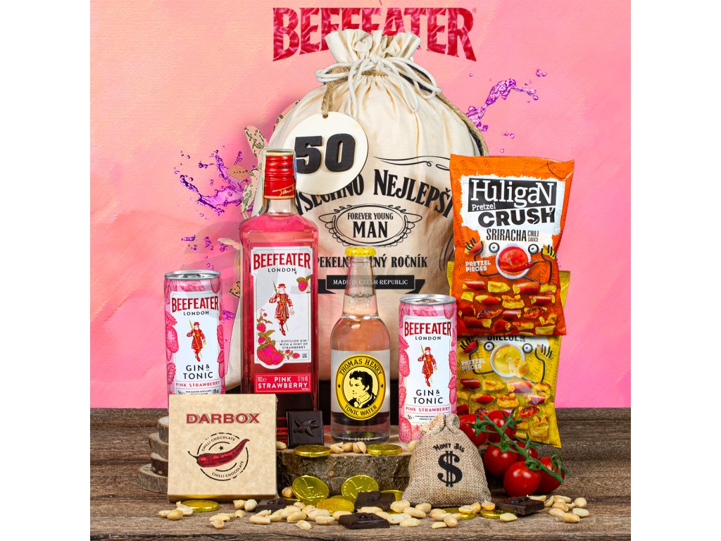 1x Bavlněný pytel 30x40 cm. 1x Gin Beefeater Pink 0,7l. Složení Obsah alkoholu činí 40% obj. Země původu: Velká Británie: voda, jalovcový destilát 1x Thomas Henry Botanical 0,2l. Složení: Voda, cukr, oxid uhličitý, přírodní bylinná příchuť s jinými přírodními příchutěmi, kyselina citronová. Obsahuje chinin. Vegan a bez lepku. Výživové hodnoty na 100ml: Energie 143kJ (34kcal), tuky 0g z toho kyseliny 0g, sacharidy 7,9g z toho cukry 7,9g, vláknina 0g, bílkoviny 0g, sůl 0g. 2x Beefeater Gin & Tonic Pink Strawberry 0,25l. Složení: obsah alkoholu 4,9%, Cukr, Gin, Konzervanty: E202, E211 Kyselina: kyselina citronová, obsahuje oxid uhličitý, přírodní aroma, přírodní aroma chinin, Voda. Země původu: Velká Británie 1x Huligan preclíky 65g (chilli) Složení: 1x Huligan preclíky 65g (sýr) Složení: 1x Měšec čokoládových mincí - 10ks Složení: cukr, kakaové máslo, sušené MLÉKO, kakaová hmota, rostlinné tuky ( palmový olej, olej z máslovníku, Sal, olej z jader manga), sušená SYROVÁTKA, MLÉČNÝ TUK, LAKTÓZA, emulgátory: lecitiny a polyglycerylpolyricinoleát, přírodní vanilkové aroma.V mléčné čokoládě obsah kakaové sušiny nejméně 25%. Vedle kakaového másla obsahuje čokoláda rostlinné tuky. Výrobek může obsahovat stopy arašídů, skořápkových plodů, obilovin obsahující lepek, sóji a sezamu. Skladujte v suchu, chraňte před teplem. Výživové údaje na 100g: Energie 2294kJ/ 550 kcal, Tuky 33g ( z toho nasycené mastné kyseliny 20g) ,Sacharidy 57 g ( z toho cukry 56 g ), Vláknina 1,9 g,Bílkoviny 5,2 g, Sůl 0,13 g. Vyrobeno pro: České cukrovinky s.r.o., Bobrová 131, 59255 Bobrová, Česká republika 1x Chilli hořká čokoláda - DARBOX 45g. Složení: Hořká čokoláda: kakaová hmota, cukr, kakaové máslo, kakaový likér, chilli papričky 2 %, kakao 64%. emulgátor: sójový lecitin, přírodní vanilkový extrakt. Zemně původu ČR