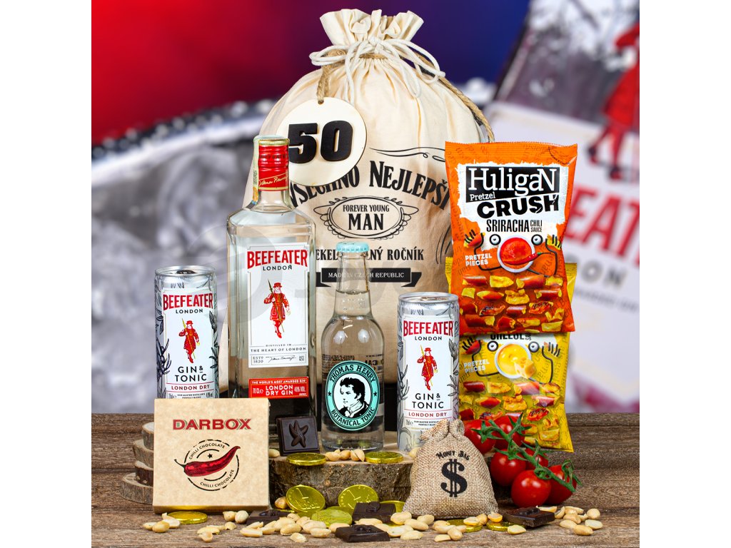 1x Bavlněný pytel 30x40 cm. 1x Gin Beefeater 0,7l. Složení Obsah alkoholu činí 40% obj. Země původu: Velká Británie: voda, jalovcový destilát 1x Thomas Henry Tonic Water 0,2l. Složení: Voda, cukr, oxid uhličitý, kyselina citronová, přírodní aroma, antioxidant kyselina askorbová, chininová příchuť. Vegan a bez lepku. Výživové hodnoty na 100ml: Energie 164kJ (39Kč), tuky 0g z toho kyseliny 0g, sacharidy 9,3g z toho cukry 9,3g, vláknina 0g, bílkoviny 0g, sůl 0g. 2x Beefeater London Dry Gin & Tonic 0,25l. Složení: obsah alkoholu 4,9%, Cukr, Gin, Konzervanty: E202, E211 Kyselina: kyselina citronová, obsahuje oxid uhličitý, přírodní aroma, přírodní aroma chinin, Voda. Země původu: Velká Británie 1x Huligan preclíky 65g (chilli) Složení: 1x Huligan preclíky 65g (sýr) Složení: 1x Měšec čokoládových mincí - 10ks Složení: cukr, kakaové máslo, sušené MLÉKO, kakaová hmota, rostlinné tuky ( palmový olej, olej z máslovníku, Sal, olej z jader manga), sušená SYROVÁTKA, MLÉČNÝ TUK, LAKTÓZA, emulgátory: lecitiny a polyglycerylpolyricinoleát, přírodní vanilkové aroma.V mléčné čokoládě obsah kakaové sušiny nejméně 25%. Vedle kakaového másla obsahuje čokoláda rostlinné tuky. Výrobek může obsahovat stopy arašídů, skořápkových plodů, obilovin obsahující lepek, sóji a sezamu. Skladujte v suchu, chraňte před teplem. Výživové údaje na 100g: Energie 2294kJ/ 550 kcal, Tuky 33g ( z toho nasycené mastné kyseliny 20g) ,Sacharidy 57 g ( z toho cukry 56 g ), Vláknina 1,9 g,Bílkoviny 5,2 g, Sůl 0,13 g. Vyrobeno pro: České cukrovinky s.r.o., Bobrová 131, 59255 Bobrová, Česká republika 1x Chilli hořká čokoláda - DARBOX 45g. Složení: Hořká čokoláda: kakaová hmota, cukr, kakaové máslo, kakaový likér, chilli papričky 2 %, kakao 64%. emulgátor: sójový lecitin, přírodní vanilkový extrakt. Zemně původu ČR