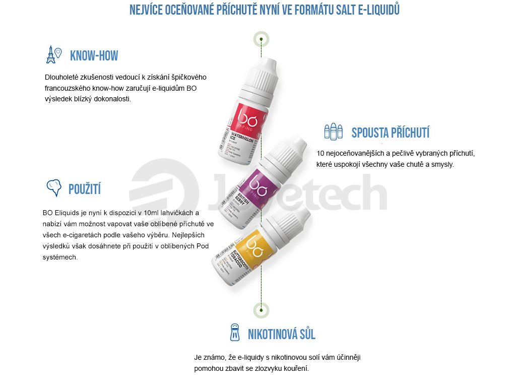 Hříšná směs, elegantní bohatost charakteristická pro tradiční virginský tabák, smíchaný s lehkým nádechem sladkého karamelu. E-liquid s nikotinovou solí francouzského výrobce BO Vaping a poměrem PG 50%, VG 50%.