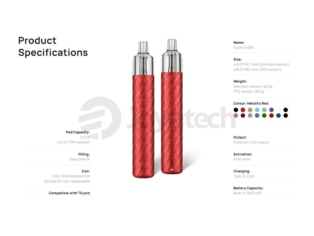 Prémiový designAspire Cyber G Slim vyniká svým elegantním a minimalistickým designem s povrchem příjemným na dotyk. Kompaktní rozměry a lehká váha činí z tohoto vape zařízení ideálního společníka pro cestování a každodenní používání v různých barevných variantách. |