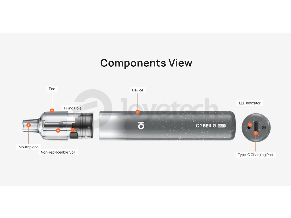 Designově se Aspire Cyber G Slim odlišuje od běžných elektronických cigaret díky svému elegantnímu a minimalistickému vzhledu s povrchem příjemným na dotyk. Absence displeje a složitých nastavení podtrhuje filozofii jednoduchosti - stačí nabít, naplnit a vapovat. 2ml Pod Cartridge se silikonovou krytkou pro snadné plnění je navržena pro optimální komfort při potahování pusa-plíce (MTL). Integrovaná žhavící hlava eliminuje nutnost složité výměny spirálek, při opotřebení jednoduše vyměníte celý pod za nový. Magnetický kontakt zajišťuje spolehlivé připojení a snadnou manipulaci. Aspire Cyber G Slim je vyrobena z kvalitních materiálů, které zaručují dlouhou životnost a odolnost proti každodennímu používání. Balení obsahuje vše potřebné pro okamžité zahájení vapování - elektronickou cigaretu, náhradní pod a USB-C kabel. Tato elektronická cigareta představuje perfektní vstupní bod do světa vapování nebo spolehlivého každodenního společníka pro ty, kteří preferují jednoduchost a spolehlivost před složitými funkcemi a nastaveními moderních vape zařízení.