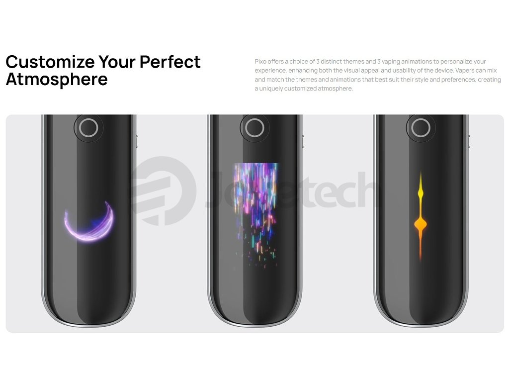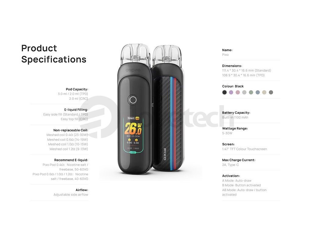 Objevte novou generaci elektronických cigaret s Aspire Pixo Pod, které získalaly prestižní ocenění nejlepšího POD zařízení na VAPEXPO v Paříži. Tato pokročilá elektronická cigareta spojuje elegantní moderní design s výjimečnou funkcionalitou a intuitivním ovládáním. Pixo Pod je vybavena velkým 1.47" TFT dotykovým displejem s grafickým rozhraním, které si můžete plně přizpůsobit podle svých preferencí. Zařízení disponuje výkonnou baterií 1100 mAh zajišťující při běžném používání až čtyři dny vapování a rychlým USB-C nabíjením 2A. Díky své univerzálnosti umožňuje různé styly vapování MTL i RDL podle zvolené Pod Cartridge s vestavnou žhavící hlavou s odporem 0,4Ω nebo 1,0Ω. Maximální výkon 30W můžete nastavit buď automaticky pomocí inteligentního Smart režimu, nebo manuálně v režimu Watts. Regulace přívodu vzduchu nabízí tři možné nastavení pro dokonalé přizpůsobení vašim preferencím.