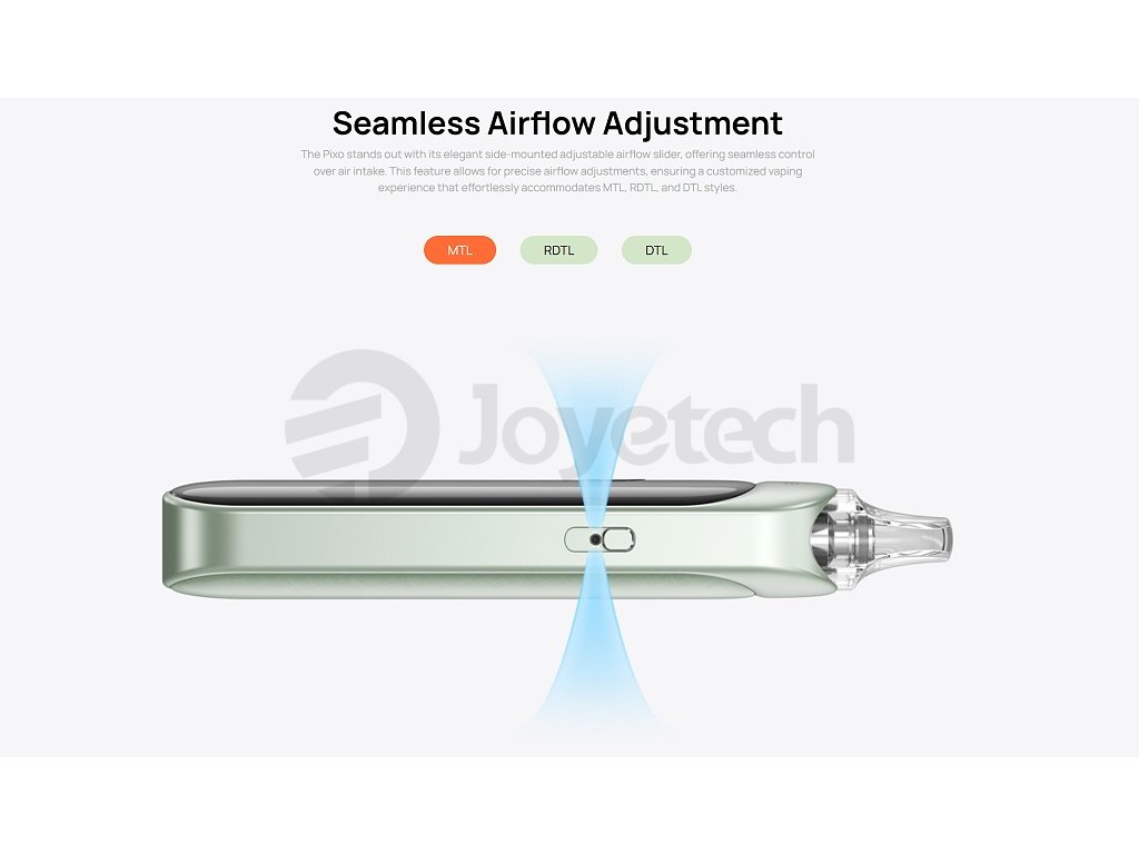 Přívod vzduchu, AirflowNastavitelná regulace přívodu vzduchu na boku zařízení nabízí tři možné pozice pro dokonalé přizpůsobení vašemu stylu vapování. Ať už preferujete utaženější tah pro MTL styl nebo volnější pro RDL, airflow regulace vám umožní najít ideální nastavení. |