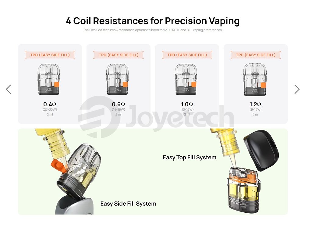 Pod CartridgePod Cartridge s objemem 2 ml nabízí dostatečnou kapacitu pro delší vapování bez nutnosti častého doplňování. V balení naleznete dvě kompletně vybavené cartridge s integrovanými žhavícími hlavami, které jsou připravené k okamžitému použití po naplnění e-liquidem. |