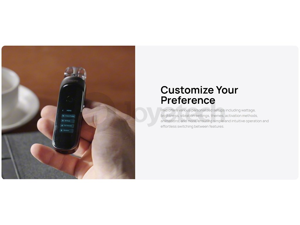 Objevte novou generaci elektronických cigaret s Aspire Pixo Pod, které získalaly prestižní ocenění nejlepšího POD zařízení na VAPEXPO v Paříži. Tato pokročilá elektronická cigareta spojuje elegantní moderní design s výjimečnou funkcionalitou a intuitivním ovládáním. Pixo Pod je vybavena velkým 1.47" TFT dotykovým displejem s grafickým rozhraním, které si můžete plně přizpůsobit podle svých preferencí. Zařízení disponuje výkonnou baterií 1100 mAh zajišťující při běžném používání až čtyři dny vapování a rychlým USB-C nabíjením 2A. Díky své univerzálnosti umožňuje různé styly vapování MTL i RDL podle zvolené Pod Cartridge s vestavnou žhavící hlavou s odporem 0,4Ω nebo 1,0Ω. Maximální výkon 30W můžete nastavit buď automaticky pomocí inteligentního Smart režimu, nebo manuálně v režimu Watts. Regulace přívodu vzduchu nabízí tři možné nastavení pro dokonalé přizpůsobení vašim preferencím.