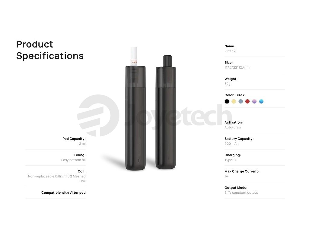 Objevte novou dimenzi jednoduchého vapování s elektronickou cigaretou Aspire Vilter 2, která dokonale spojuje elegantní prémiový design s maximální uživatelskou přívětivostí a bezstarostným používáním. Toto kompaktní a stylové zařízení představuje ideální volbu pro všechny vapery, kteří hledají kvalitní elektronickou cigaretu bez zbytečných komplikací a složitého nastavování. Lehké kovové tělo v kombinaci s precizním zpracováním vytváří luxusní dojem, který ocení jak úplní začátečníci, tak i zkušení uživatelé hledající spolehlivého každodenního společníka. Srdcem zařízení je výkonná integrovaná baterie o skvělé kapacitě 900mAh, která poskytuje více než dostatečnou výdrž pro pohodlné celodenní vapování bez nutnosti častého nabíjení. Díky opravdu kompaktním rozměrům 117,2 x 22 x 12,4 mm se Aspire Vilter 2 snadno vejde do kapsy i menší kabelky a stane se vaším nepostradatelným každodenním společníkem pro jakoukoliv příležitost. Zařízení pracuje s konstantním výstupním napětím 3,4V, což zajišťuje naprosto stabilní výkon a konzistentní chuť při každém jednotlivém potahu během celého cyklu baterie. Speciální magnetický kontaktní systém umožňuje rychlou a snadnou výměnu podů, přičemž celková robustní konstrukce zaručuje dlouhodobě spolehlivé a bezproblémové fungování. S Aspire Vilter 2 získáte skutečně elegantní a kvalitní elektronickou cigaretu, která překoná vaše očekávání ohledně kvality zpracování, stabilního výkonu i moderního stylu.