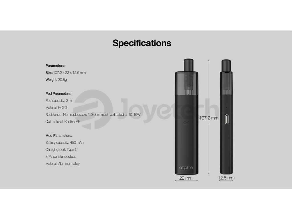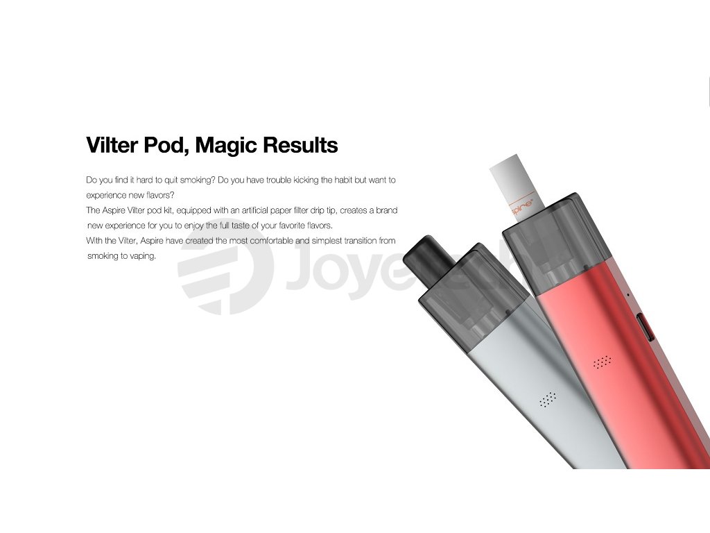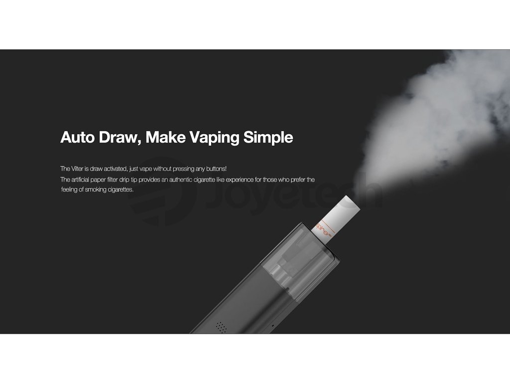 Unikátní automatická Pod elektronická cigareta s možností použití jak klasického Delrinového náustku, tak speciálních umělých papírových filtrů, které dokonale simulují potah jako u klasické cigarety. Vestavná baterie s kapacitou 450mAh, Pod cartridge o objemu 2ml se zabudovanou žhavící hlavou s mesh spirálkou s odporem 1,0ohm. Automatická aktivace potahu, USB-C nabíjení. Rozměry: 107,2mm x 22mm x 12,5mm.