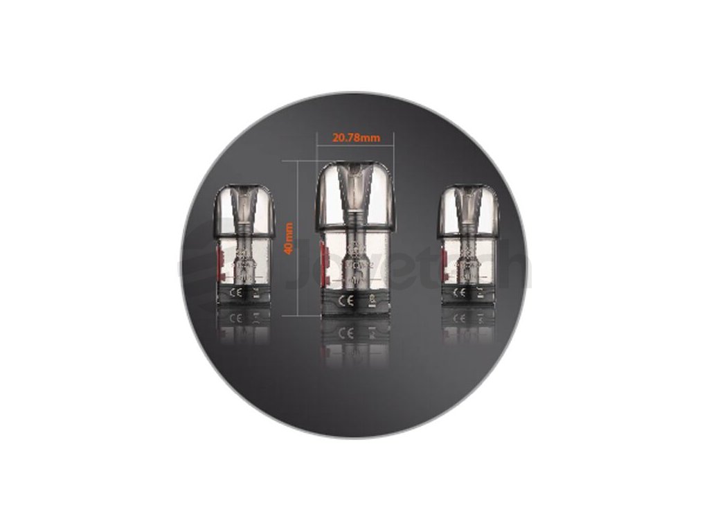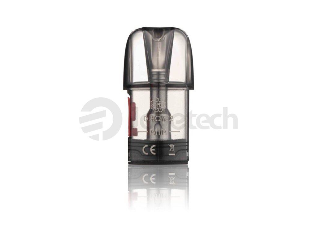 Ve vrchní části se nachází cartridge ze série dotPod Nano. Tato cartridge nabídne základní objem 2 ml a praktické boční plnění se silikonovou záslepkou. V základním balení potom najdete hned dvě tyto cartridge s rozdílnými odpory integrovaného tělíska. První z nich nabídne odpor 0,8 ohm a je vhodná pro vzdušnější klasické šlukování a použití náplní s volným nikotinem. Druhá cartridge disponuje odporem 1,0 ohm a je ideální pro nikotinové soli a utažený MTL vaping.