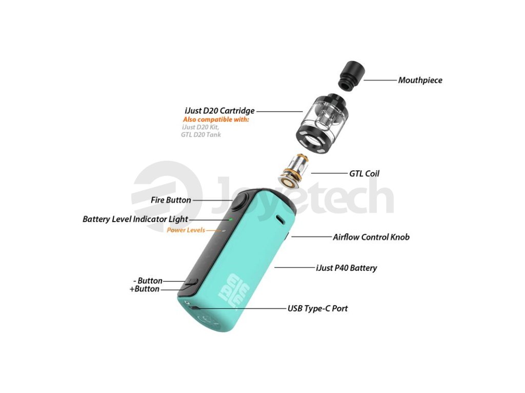 V těle se nachází integrovaná baterie s obrovskou kapacitou 1500 mAh pro dlouhé hodiny nerušeného používání a intenzivní vaping. Díky velké kapacitě baterie si poradí také s dlouhou výdrží u výkonnějšího DL vapingu. V případě potřeby si baterii můžete kdykoliv dobít pomocí rychlého portu USB-C proudem až 2A. Ve vrchní části se nachází cartridge iJust D20 s objemem 3 ml, která je kompatibilní se žhavícími tělísky z platformy Eleaf GTL. V základním balení potom najdete tělísko s odporem 0,4 ohm pro přímé potahování a tělísko 0,8 ohm pro klasické šlukování. Jako bonus najdete na zařízení také pohodlnou manuální regulaci airflow pro nastavení co nejoptimálnější tuhosti potahu. Eleaf iJust P40 Pod Kit je stylová a multifunkční e-cigareta, se kterou se nebudete ani na vteřinu nudit.