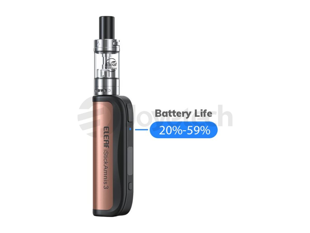 V těle e-cigarety Eleaf iStick Amnis 3 se ukrývá integrovaná baterie se solidní kapacitou 900 mAh pro dlouhé hodiny nerušeného vapování. O aktuálním stavu baterie budete mít neustálý přehled díky praktické LED diodě umístěné pod spínacím tlačítkem. Dioda mění barvu dle aktuálního nabití baterie, při plném nabití svítí zeleně, střední kapacitu signalizuje modrá dioda a téměř vybitý stav potom dioda červená.