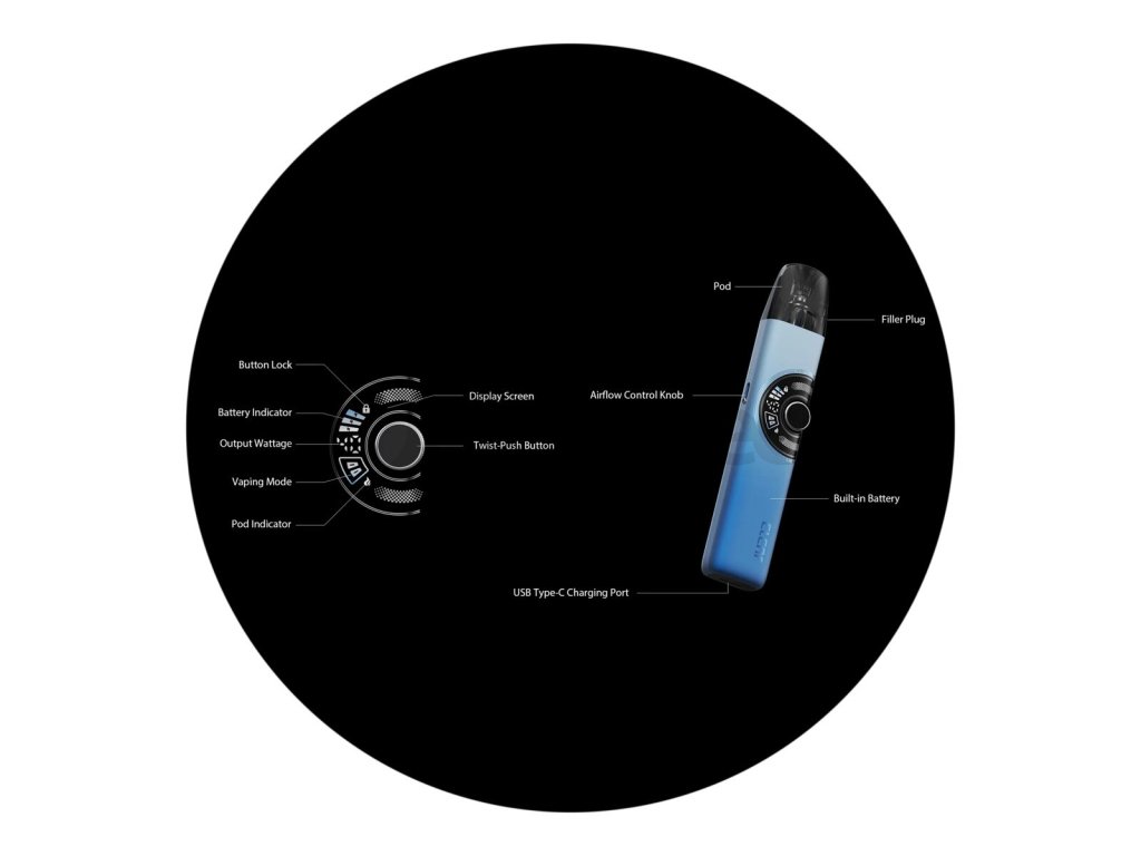 Součástí ovládací jednotky zařízení je také zajímavý kulatý displej s několika ikonami a segmentovým ukazatelem právě nastaveného výstupního výkonu. Všechny podstatné prvky tak máte neustále na očích a snadno si ověříte, jaký máte nastavený režim, jaký je stav baterie, jak vysoký máte výkon a zda máte uzamčené tlačítko.