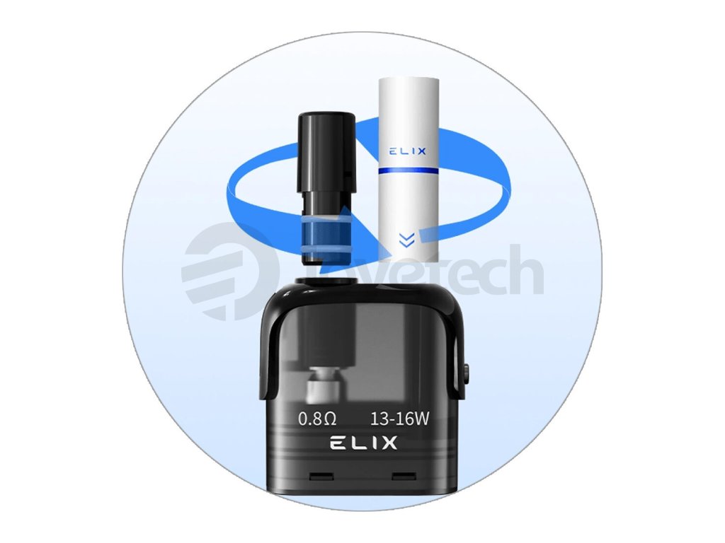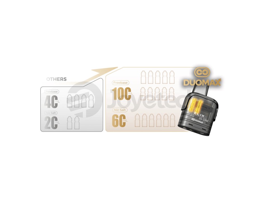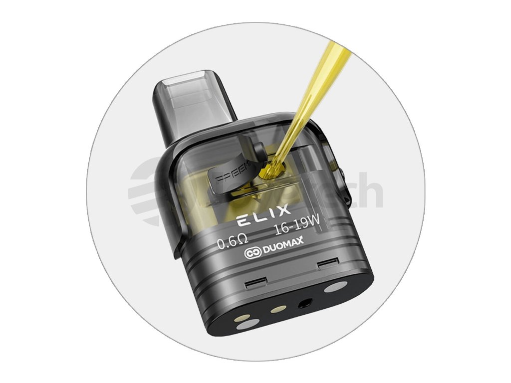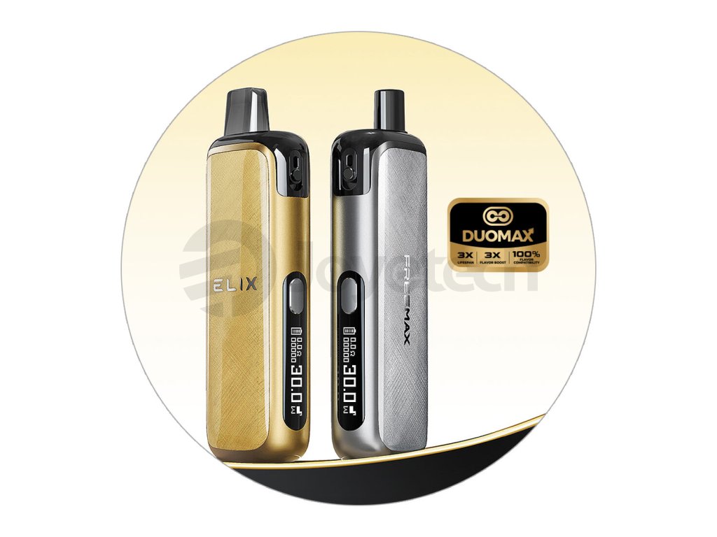 Freemax Elix se představuje s cartridgemi opatřenými novou inovativní technologií Duomax. Cartridge typu Duomax disponují dvěma oddělenými komorami, přičemž v každé se nachází samostatně umístěné mesh pletivo. Díky podpoře duálního mesh pletiva zvládne e-cigareta rychlejší náběh žhavení, plnější a výraznější chuť a delší životnost. Proti konkurenčním běžným cartridgím se jedná až o trojnásobně delší životnost a trojnásobně výraznější chuť.