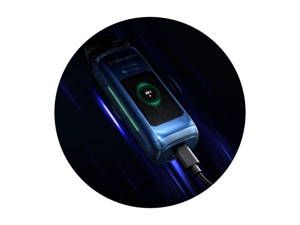 Pokud budete i přes solidní výdrž e-cigarety nuceni vyhledat nabíječku, v ten moment oceníte podporu rychlého nabíjení proudem až 5 V/2 A přes konektor USB-C. Za pouhých 20 minut je baterie schopna se dobít až na 50 % kapacity a vy tak budete moci obratem pokračovat ve vapování.