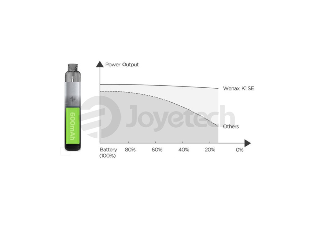 Hlavní výsadou modelu Wenax K1 SE Pod Kit je především nízká hmotnost. Celá e-cigareta nabídne hmotnost pouhých 32 g, díky čemuž se jedná o jedno z nejlehčích zařízení na trhu. Pokud se neradi taháte s těžšími elektronickými gripy a potřebujete mít svou e-cigaretu neustále při sobě, je Wenax K1 SE jasnou volbou, skvěle se hodí jak do společnosti, tak také do zaměstnání, nebo na chvíle turistiky.