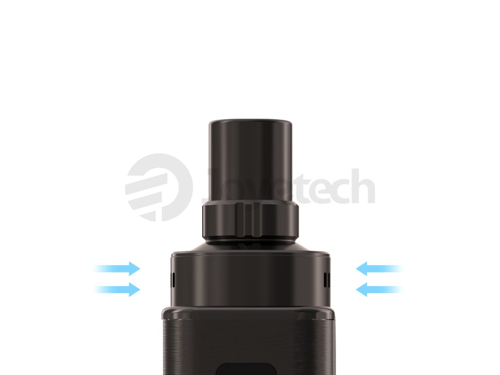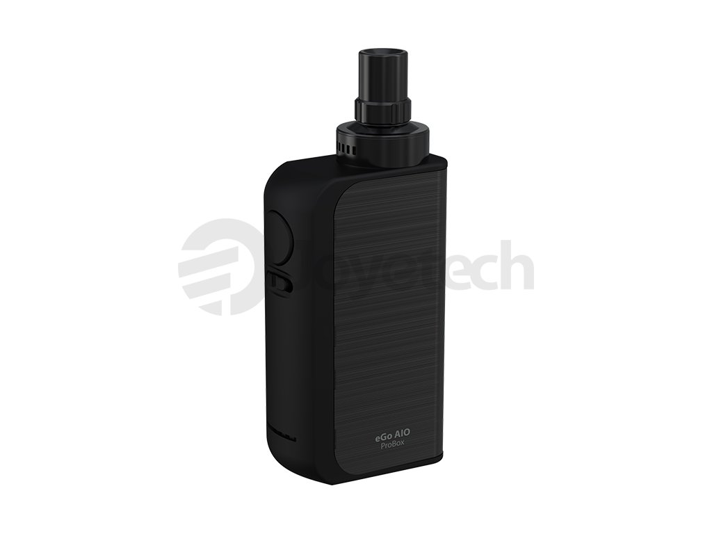 Joyetech eGo AIO ProBox je druhá verze oblíbeného ALL in ONE gripu, který přináší mnohá vylepšení. Již na první pohled je zřetelný jeho nový a moderní vzhled. Tradiční ergonomický tvar těla skrývá vestavěnou baterii o kapacitě 2100mAh. Velkou novinkou je volitelný režim konstantního a přímého napětí (viz detailní popis). Opět se můžeme spolehnout na systém horního plnění - po odšroubování vrchní části, plníte liquid jedním ze dvou otvorů přímo do nádržky o objemu 2ml. Vrchní regulace přívodu vzduchu byla nově umístěna po stranách clearomizeru - převzato od Cubis Pro. eGo AIO ProBox spolupracuje s atomizery řady BF. Clearomizer je podsvícen LED diodami. Při zamčené baterii dlouhým stiskem spínače si můžete vybrat barvu podsvícení clearomizeru (červené, žluté, zelené, modré, indigo, bílé a fialové). Nabíjení umožňuje micro USB vstup (e-cigaretu lze používat i při nabíjení).