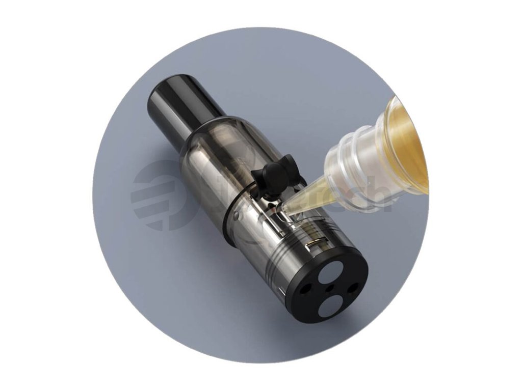 Samotná cartridge ve vrchní části nabídne solidní objem 2 ml. Díky vyššímu odporu integrované hlavy si poradí s dlouhou životností na jedno naplnění a nabídne minimum úbytku e-liquidu při používání. Pokud však na plnění přeci jen dojde, jednoduše stačí odklopit silikonovou záslepku v její boční části a opětovně ji doplnit. Celou cartridge máte znovu naplněnou během několika sekund.