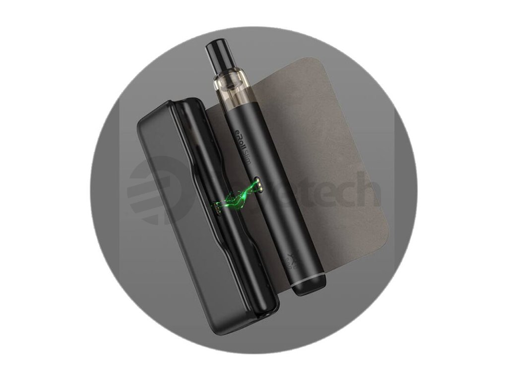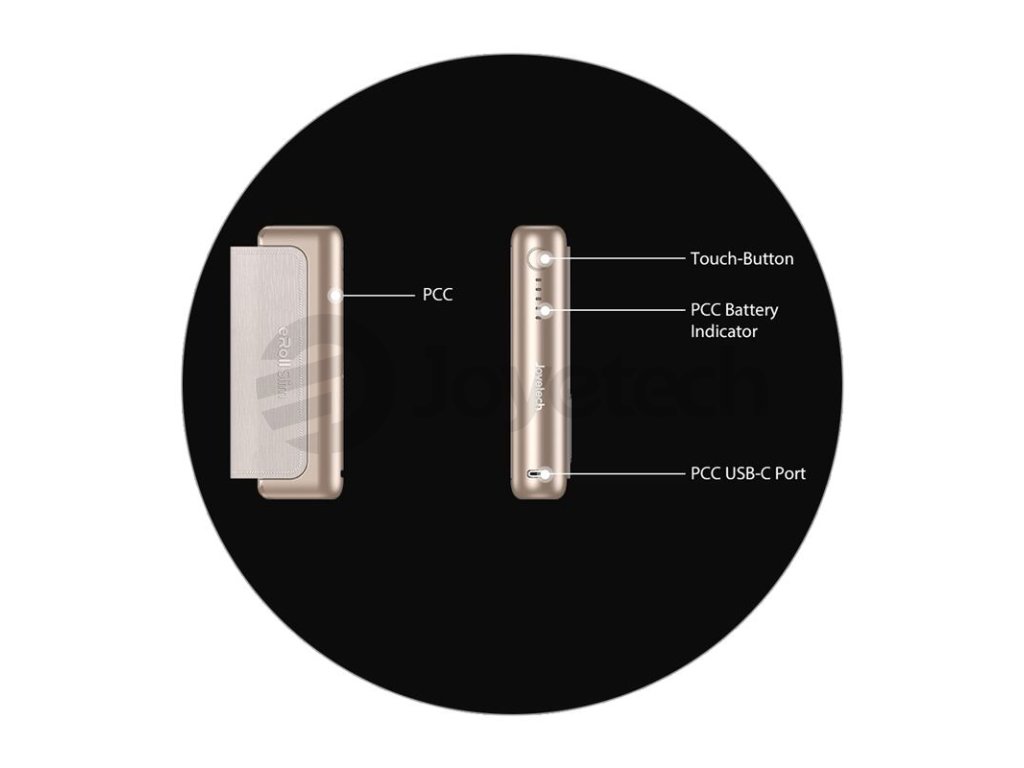Praktickou sadu jednoduché MTL e-cigarety a dobíjecího pouzdra představuje výrobce Joyetech. Elektronická cigareta Joyetech eRoll Slim PCC Kit se pyšní nejen kompaktními rozměry, ale také originálním zpracováním a krásným designovým provedením, se kterým se budete vyjímat i ve společnosti. Přináší elegantní spojení kompaktní trubkové e-cigarety a stylového pouzdra s vestavěnou baterií pro rozšíření kapacity baterie samotné e-cigarety a pro pohodlné dobíjení na cestách. Samotná e-cigarety eRoll Slim nabídne kompaktní rozměry s délkou 120 mm a průměrem pouhých 16 mm. V jejím jádru se nachází integrovaná baterie s kapacitou 480 mAh a podporou dvou metod nabíjení. Boční část je opatřena magnetickým kontaktem pro nabíjení pomocí pouzdra. Ve spodní části však najdete také tradiční USB-C port pro snadné dobití e-cigarety pomocí USB-C kabelu.