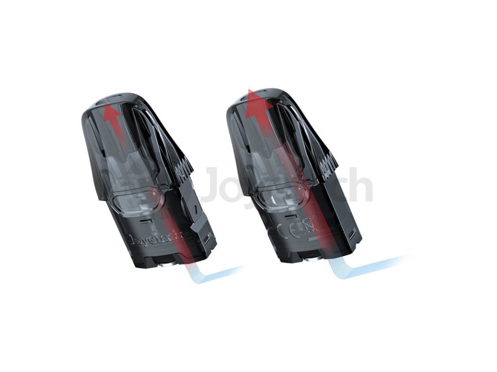 Novinkou jsou speciální cartridge Joyetech EVIO s dvojitým systémem airflow. Umístěním cartridge na tělo baterie jedním ze dvou směrů ovlivníte výslednou tuhost potahu. Sami si tak zvolíte, zda vám vyhovuje spíše utaženější, nebo vzdušnější varianta MTL potahu. Volba je čistě ve vašich rukou.