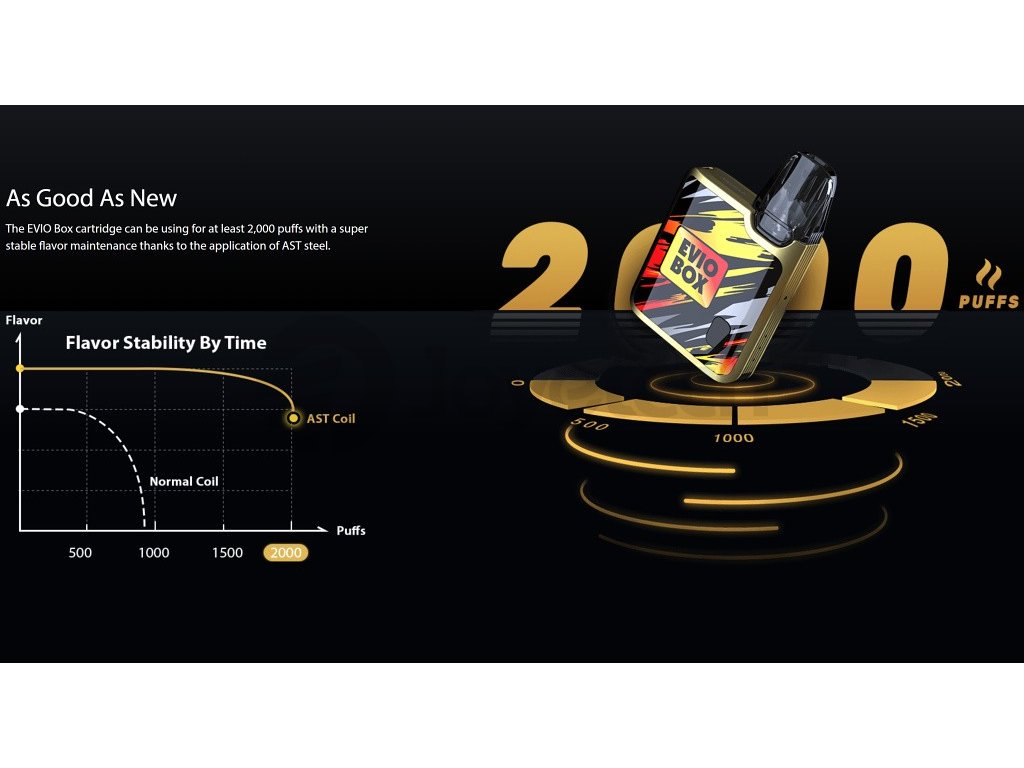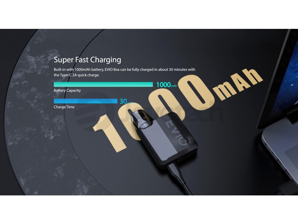 Kompaktní Pod elektronická cigareta, která se vejde pohodlně do kapsy nabízí dostatečný výkon a prvotřídní čip s technologií AST. Joyetech Evio Box nabízí vysokou rychlost žhavení už za 0,001 s, rychlé nabíjení pomocí moderního USB-C konektoru, dvojí způsob spínání potahu, a to jak plně automatický, tak manuální pomocí tlačítka. O samotný výkon s postarají hned tři režimy intenzity žhavení. Kapacita baterie 1000mAh, objem Cartridge 2ml s dvojitým Airflow systémem, rozměry 75 x 49 x 14 mm, 2x žhavící hlava Joyetech EN v SETU. Joyetech EVIO Box je vhodný jak pro klasické MTL šlukování, tak i pro utaženější DL, kdy je pára vdechována přímo do plic. Barevné provedení Gunmetal.