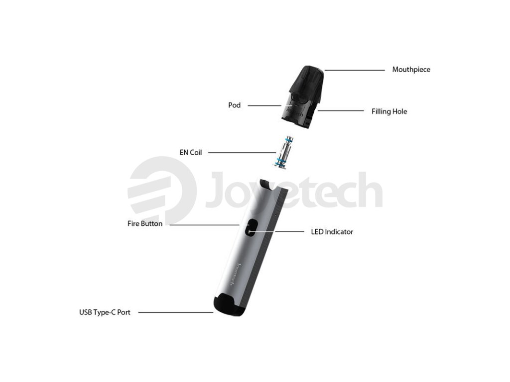 Ve vrchní části se nachází cartridge s objemem 2 ml a praktickým systémem bočního doplňování. Cartridge je kompatibilní se žhavícími tělísky Joyetech EN Mesh. V balení najdete dvě tělíska EN Mesh s odporem 0,8 ohm. Uvnitř těchto tělísek se nachází mesh pletivo pro perfektní chuťové podání při každém potahu. Tělíska nabídnou také příjemnou produkci páry pro klasické šlukování.