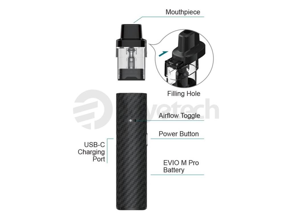 Krásný pod systém Joyetech EVIO M Pro Pod Kit se pyšní elegantně zpracovanou konstrukcí s jedinečným digitálním displejem zapuštěným přímo do konstrukce těla. Díky maximálnímu výstupnímu výkonu 30W s možností regulace si bude skvěle rozumět s rozdílnými odpory cartridgí z platforem EVIO M Pro a EVIO Grip. Pro co nejsnazší používání a pohodlné nastavení uživatelských preferencí je také vybaven praktickým bočním systémem airflow, multifunkčním tlačítkem a výsuvným horním plněním bez nutnosti odpojování cartridge z těla baterie během doplňování. Díky vestavěné baterii s ohromující kapacitou 1100mAh si užijete dlouhé hodiny nerušeného a intenzivního vapování, vše navíc s podporou moderního nabíjení USB-C. Joyetech EVIO M Pro Pod Kit přináší plnohodnotný MTL požitek z vapování a vše potřebné pro každodenní využití.