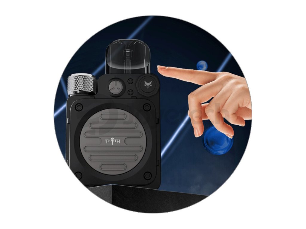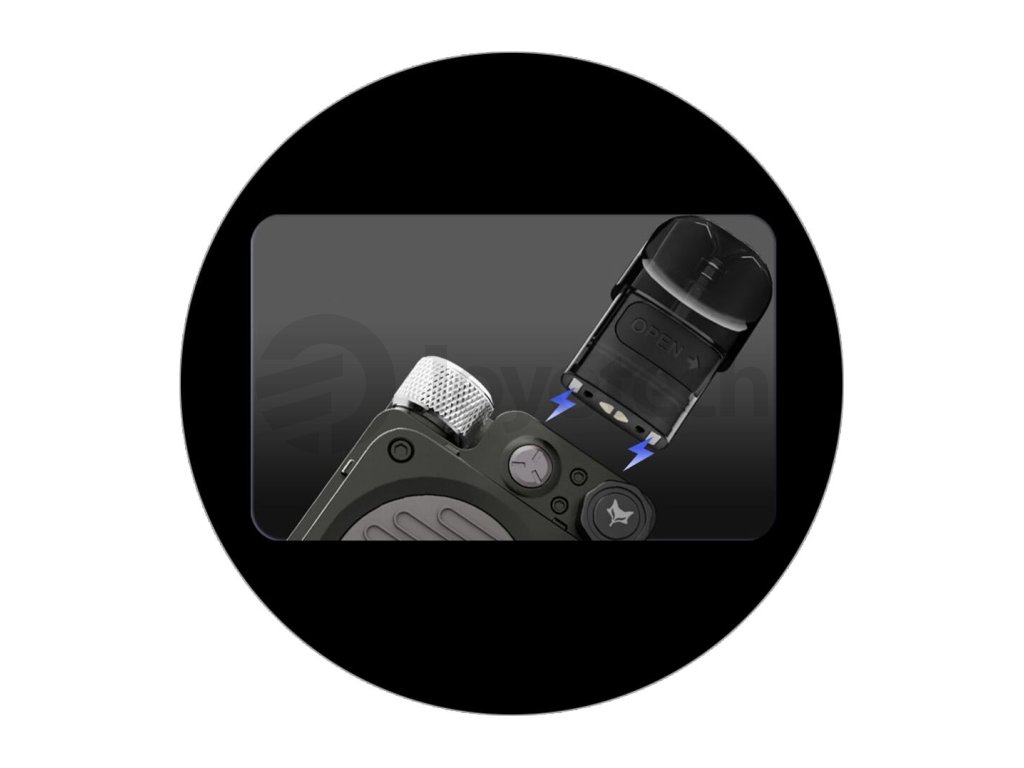 Pro spínání samotného žhavení můžete využít jednu ze dvou dostupných metod. Pokud preferujete konvenční spínání, stačí podržet spínací tlačítko ve vrchní části a začít potahovat. Jestliže však preferujete jednoduchost moderních pod systémů, pro spuštění žhavení vám také postačí jen potáhnout z náustku, žhavení se spustí automaticky bez nutnosti tisknout tlačítko.