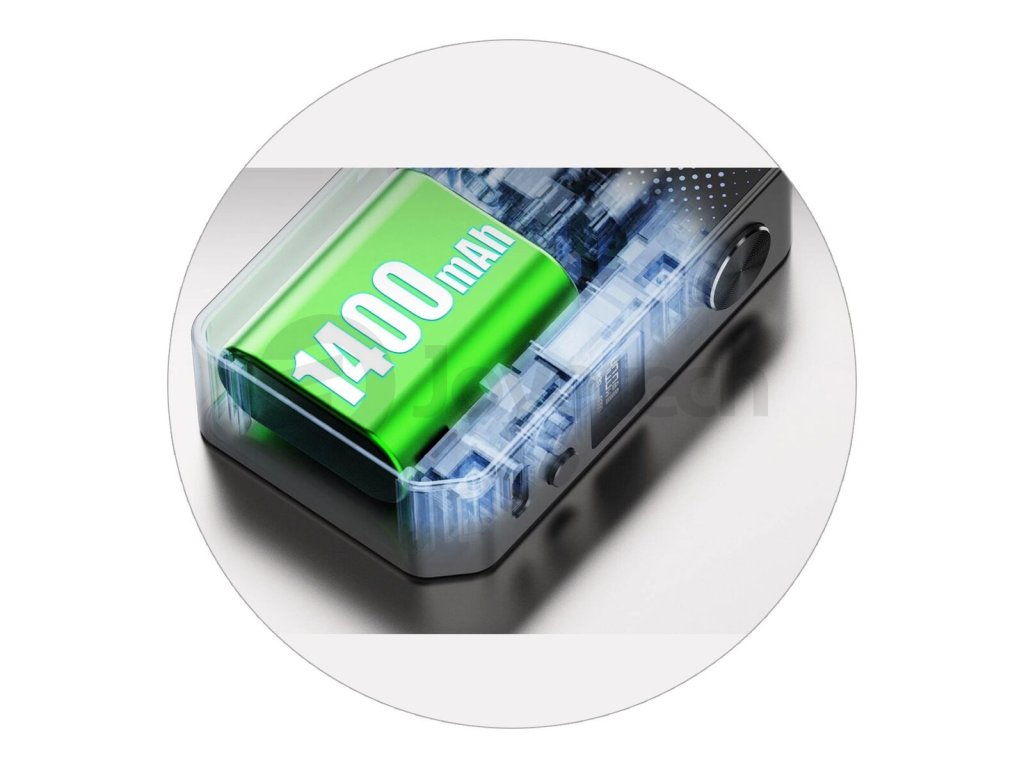 Tělo zařízení disponuje obrovskou integrovanou baterií o kapacitě 1400mAh, ta zajišťuje dlouhou výdrž a možnost intenzivního potahování po mnoho hodin bez nutnosti častého opětovného dobíjení. Pro potřeby nabíjení najdete v přední části moderní rozhraní USB-C s podporou nabíjení proudem až 1.4A.