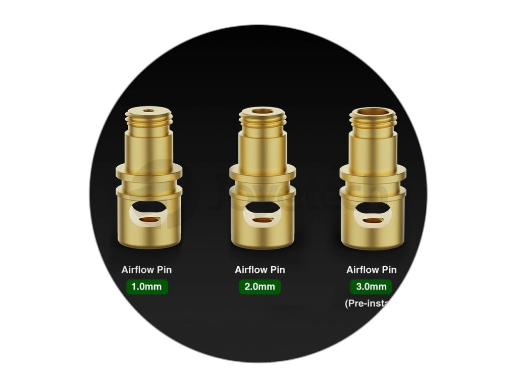Spodní kontakt boro tanku tvoří pin se vzduchovou vložkou, která ovlivní výslednou tuhost při potahování a jaké množství vzduchu do tanku vstoupí. V balení na vás čekají hned tři piny s průměry 1mm, 2mm a 3mm pro potřeby všech typů vapování.