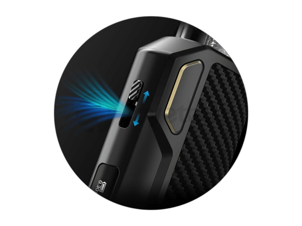 Populární manuální regulace airflow nesmí chybět ani u tohoto typu e-cigarety. V boční části je vybavena praktickým manuálním posuvníkem, který slouží pro uzavření, nebo otevření vzduchového otvoru s možností plynulé regulace. Jedním pohybem prstu si tak přizpůsobíte výslednou tuhost svým představám.