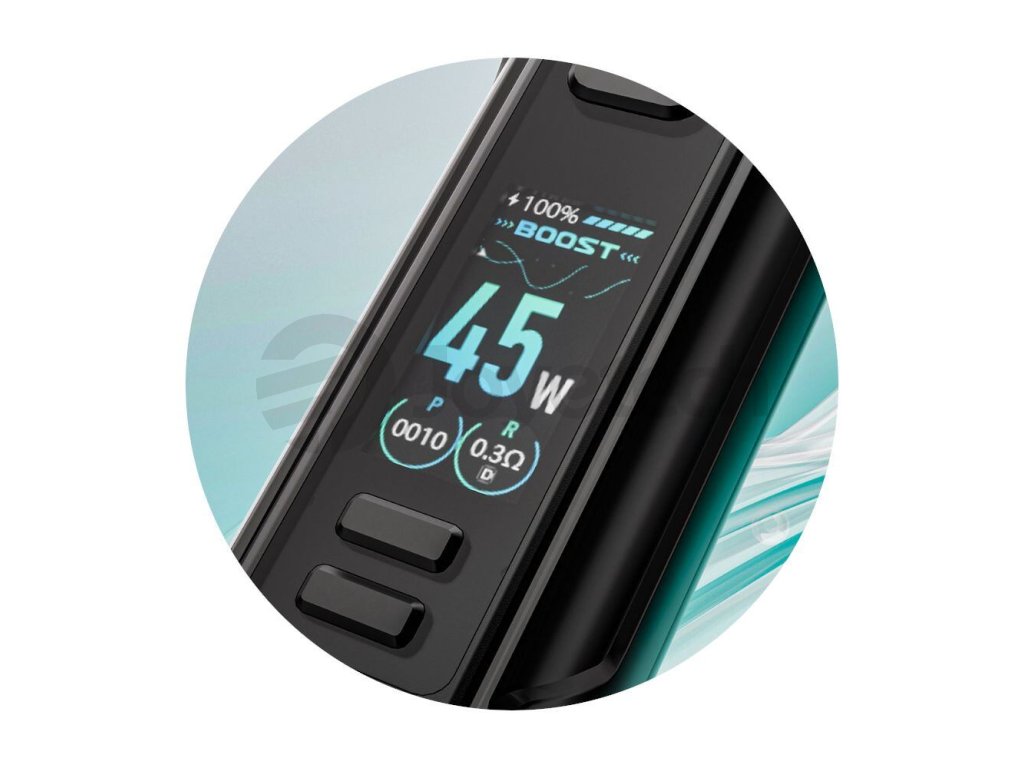 E-cigaretu pohání špičková elektronika umožňující intenzivní vaping s maximálním výkonem až 45 W. Hravě si poradí i se sub-ohmovými Dual Mesh cartridgemi pro tvorbu obrovských hustých mraků. Spolehnout se přitom můžete na inteligentní režim, který automaticky nastaví vhodný výstupní výkon dle odporu připojené cartridge, a zároveň omezí maximální rozsah regulovatelného výkonu, aby nemohlo dojít k jejímu poškození. Pomocí dvou menších tlačítek pod displejem lze výkon jednoduše upravit v daném rozsahu plynule po 1 Wattu.