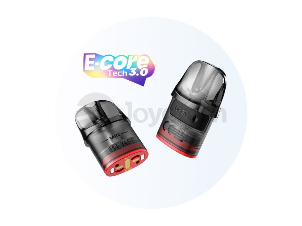Použitá technologie nové generace E-CORE TECH 3.0 zajišťuje bohaté konzistentní podání chuti, přičemž zvýrazňuje sladkost a chladivost e-liquidu. V balení najdete rovnou dvě inovované cartridge řady E-Plus s Dual Mesh technologií a pětivrstvou technologií výroby, která eliminuje nežádoucí únik e-liquidu. Odpory jsou 0,3 a 0,6 Ω se shodným objemem 3 ml. Platforma navíc zůstává zpětně kompatibilní s původními cartridgemi E-Plus, čímž se dále rozšiřuje variabilita použití.