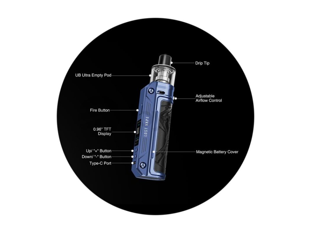 Jádro je poháněno upgradovaným čipem Quest 2.0, který se postará o perfektní výsledky při vapování. Čip nabídne rychlý náběh žhavení a stabilní výkon. Třešňičkou na dortu je potom možnost úpravy barevného rozhraní. Přední část je opatřena ovládacím panelem se žhavícím tlačítkem, velkým barevným displejem a dvěma regulačními tlačítky. Zařízení umožňuje vlastní regulaci výstupního výkonu v rozpětí 5 - 80 W. V zadní části na vás potom čeká systém manuální regulace airflow pro vyladění výsledné tuhosti potahu. Ve vrchní části se nachází cartridge s obrovským objemem 5,5 ml a podporou žhavících hlav UB Ultra. Mimo cartridge najdete v balení dvě hlavy UB Ultra s odpory 0,15 ohm a 0,2 ohm pro DL vaping. Lost Vape Thelema Urban Pod Kit je špičkové zařízení pro vzdušné formy vapování s perfektní elektronikou, bohatou produkcí páry a vynikajícím podáním chuti.