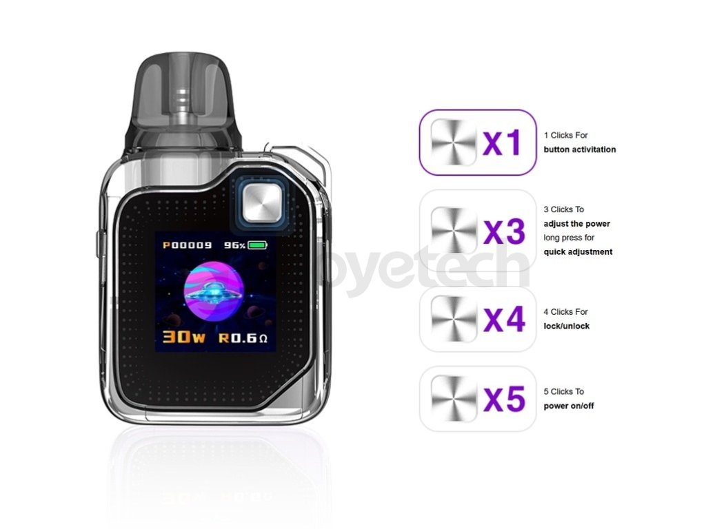 Intuitivní ovládáníPraktické ovládací tlačítko u displeje nabízí jednoduché kombinace pro všechny funkce zařízení. Jedním stiskem spínáte žhavení, třemi stisky vstupujete do nastavení výkonu, čtyřmi stisky zamykáte nebo odemykáte tlačítko a pěti stisky vypínáte elektronickou cigaretu. Systém ovládání je rychlý, přehledný a uživatelsky přívětivý pro každodenní použití. |
