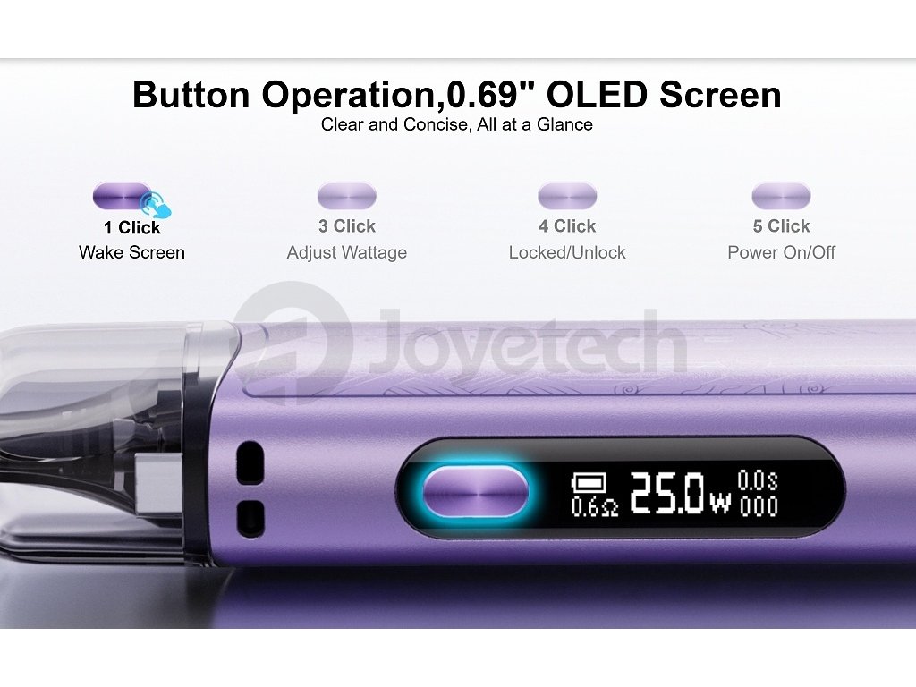 OLED displejVysoce kvalitní 0,69" OLED displej poskytuje jasné a přehledné zobrazení všech důležitých informací včetně výkonu, stavu baterie a režimu vapování. Displej je umístěn na boční straně zařízení pro snadné čtení během používání a nabízí intuitivní uživatelské rozhraní. |