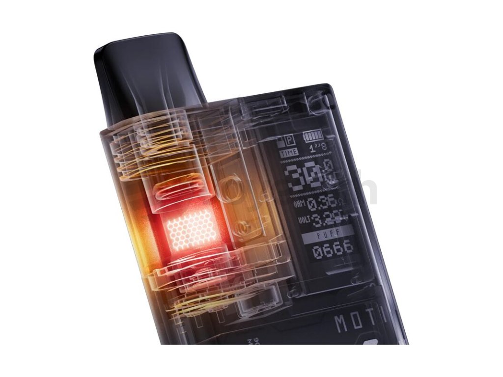 Mimo baterii je zařízení poháněno také moderním čipem MCU, který zprostředkuje nejen mimořádný chuťový zážitek, ale nabídne také snadné uživatelské nastavení. V boční části se nachází přehledný displej zařízení, který zobrazuje všechny důležité parametry a hodnoty během vapování. Výkon lze regulovat v rozpětí 5 - 30 W pomocí tlačítka ve vrchní části zařízení. V boční části vedle displeje se potom nachází další tlačítko, které slouží pro zapnutí a vypnutí, nebo také pro sepnutí potahu. Pro samotné potahování potom můžete využít také funkci automatického spínání pouhým potažením z náustku. Ve vrchní části se nachází praktická cartridge s objemem 2 ml, která je kompatibilní s tělísky Moti Play. Mimo cartridge na vás v balení čeká jedno tělísko z řady Moti Play s mesh pletivem a odporem 1,0 ohm pro klasické šlukování. Samostatně si můžete pořídit také tělísko s odporem 0,45 ohm pro RDL vaping. Moti Play Pod Kit je precizně navržená elektronická cigareta, která v sobě snoubí eleganci a praktičnost.