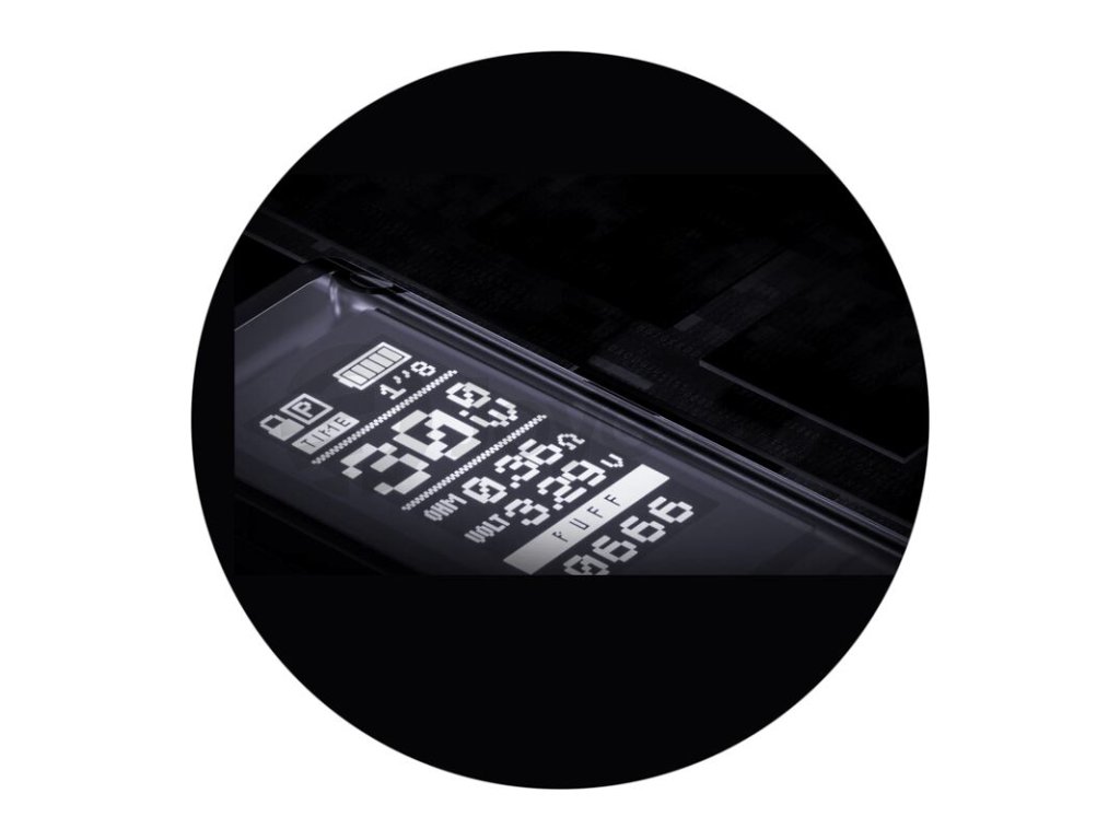 Všechny potřebné parametry na jednom místě. Boční panel nabídne krásný a přehledný displej, na kterém budete mít neustálý přehled o nastaveném výkonu, odporu tělíska, napětí baterie, nebo o počtu potahů a aktuálním stavu baterie. Displej je krásně čitelný a žádný z potřebných parametrů během užívání zaručeně nepřehlédnete.