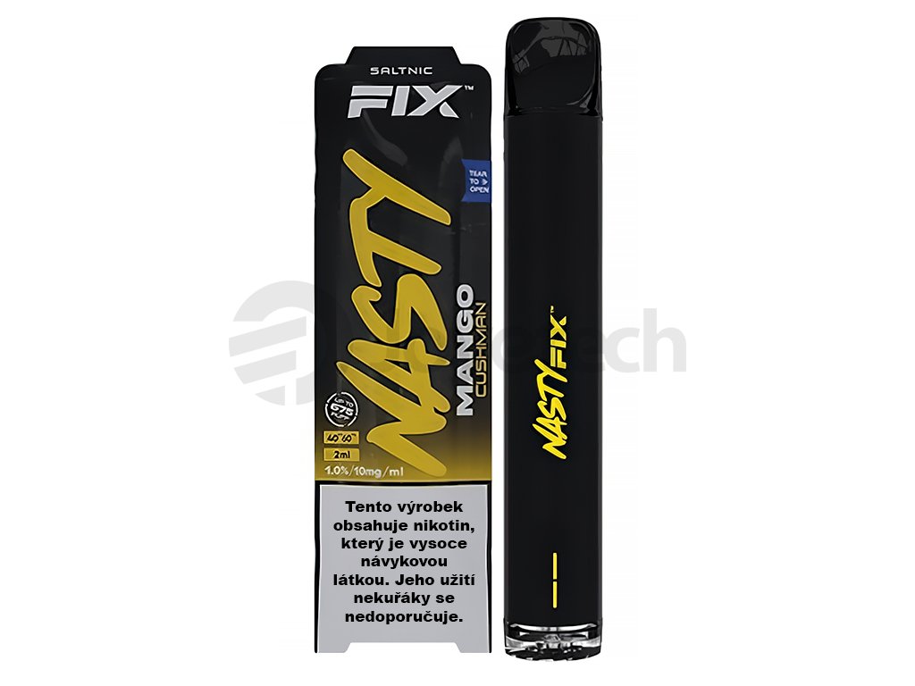 Ničím nezaměnitelná chuť oblíbeného svěžího tropického manga. Nasty Juice Air Fix je jednorázová elektronická cigareta obsahující 2 ml předplněného e-liquidu uvedené příchutě. Obsahuje nikotinovou sůl, která se rychleji vstřebává do těla a není tak nutné časté potahovaní, jako je tomu klasických liquidů. Cigareta je napájena vestavěnou baterií o kapacitě 700 mAh, se kterou dosáhnete až 675 potažení. Spodní část zařízení disponuje regulací přívodu vzduchu pro optimální nastavení kouřivosti. Jde o ideální řešení pro kuřáky, kteří potřebují jednorázově překlenout pobyt v nekuřáckém prostředí. Obsah nikotinu 10mg/1ml.