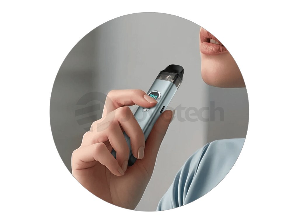 Dominantou celé e-cigarety je jednoznačně displej inspirovaný klasickými hodinkami. Díky kulatému profilu utváří elegantní dojem a příjemně dokresluje další designové prvky celé e-cigarety. Na displeji si navíc můžete nepřetržitě hlídat to, co se s vaší e-cigaretou právě děje a jaké máte nastavené hodnoty. V hlavním rozhraní budete mít přehled o aktuálním výstupním výkonu, stavu baterie, odporu cartridge a počtu potahů. Po připojení nového podu displej automaticky zobrazí doporučený výkon a v případě nabíjení se vám na displeji ukáže zbývající čas do konce nabití.