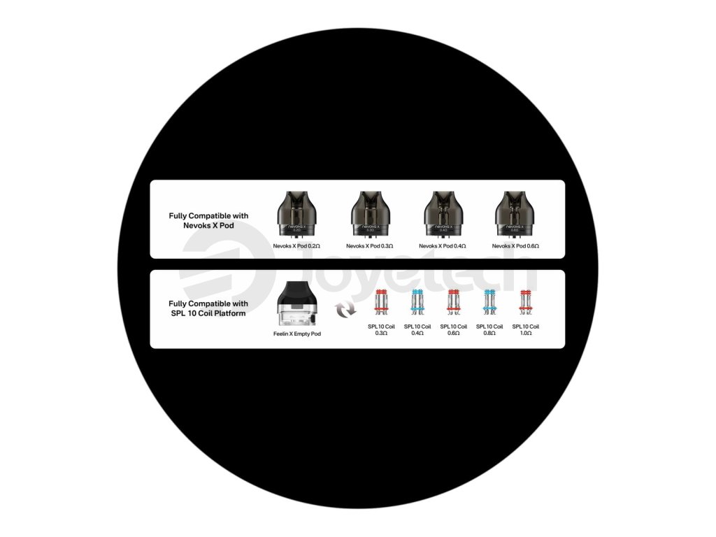 Mimo nové cartridge s integrovanou hlavou je zařízení kompatibilní také s platformou žhavících hlav SPL 10 a cartridgí Feelin X na vyměnitelné hlavy. V základním balení najdete žhavící hlavu s odporem 0,6 ohm a prázdnou cartridge s objemem 5 ml pro RDL a MTL potah. Díky podpoře cartridgí s integrovanou hlavou i na vyměnitelné hlavy získáváte obrovskou svobodu ve výběru vhodných součástí pro žhavení.