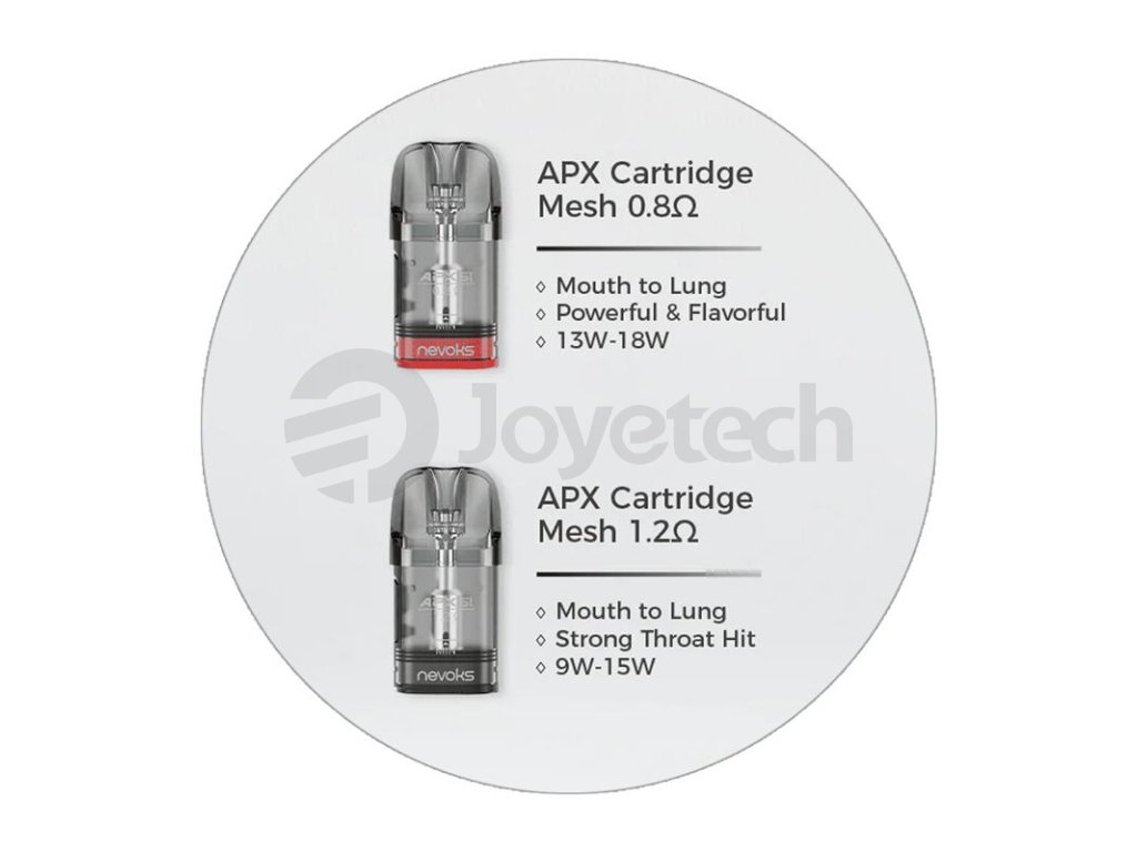 E-cigareta Nevoks Pagee Air Pod Kit je kompatibilní s platformou cartridgí APX Mesh. Ty nabídnou objem 2 ml a mesh pletivo v jádru pro výraznou chuť a rychlý náběh žhavení. V základním setu najdete jednu cartridge z této platformy, ta nabídne odpor 0,8 ohm a je tak ideálním kompromisem mezi volnějším a utaženějším MTL potahem.