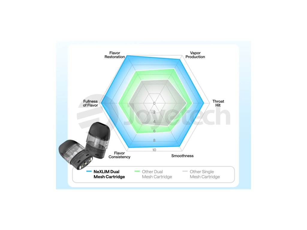 Klíčovým prvkem celé e-cigarety je přítomnost technologie Dual Mesh. Cartridge jsou tak vybaveny duálním mesh pletivem, které je navrženo speciálně pro využití s režimy ECO a BOOST. Při spuštění ECO režimu běží střídavě jedno a následně druhé mesh pletivo pro prodloužení životnosti a úsporu baterie i náplně. V režimu BOOST se aktivují obě dvě mesh pletiva souběžně, čímž se navýší odpařovací plocha, získáte tak skutečně bohatou a výraznou chuť a zároveň si cartridge zvládne poradit s vyšším výstupním výkonem.