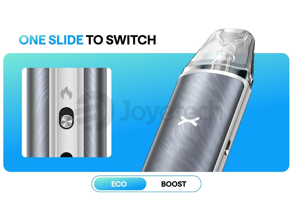 Uživatelské rozhraní Přepínání mezi ECO a BOOST režimem probíhá snadno pomocí posuvníku bez nutnosti displeje nebo tlačítek. Vapování se aktivuje automaticky potahem, což zajišťuje jednoduché a intuitivní ovládání bez složitého nastavování a učení se komplikovaných funkcí. |