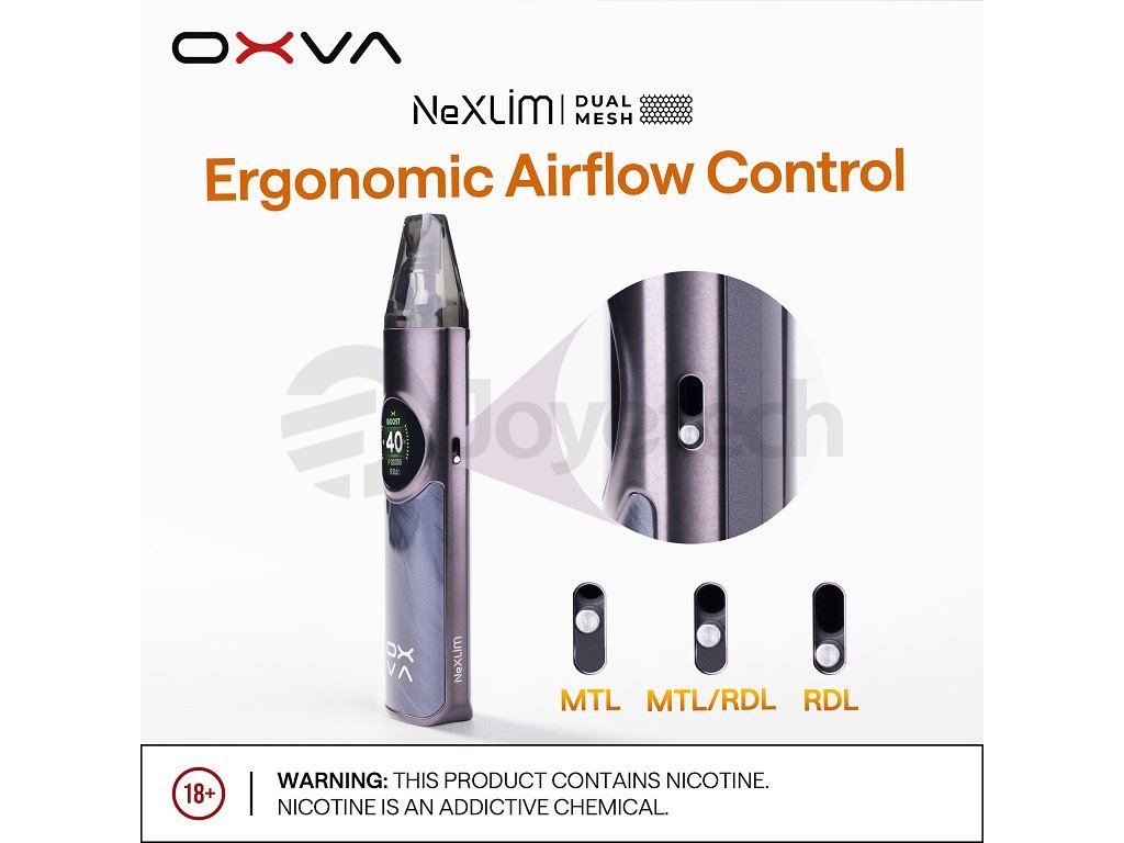 Designově se OXVA NeXLIM vyznačuje prémiovou konstrukcí z kvalitní zinkové slitiny doplněné o stylové panely z broušeného hliníku, imitace kůže nebo karbonu podle zvolené varianty. K dispozici je 12 různých barevných provedení, takže každý uživatel si najde design odpovídající jeho osobnímu stylu. Zařízení nabízí dva inteligentní režimy výkonu - Eco režim pro úsporné MTL vapování s prodlouženou výdrží baterie a Boost režim pro výkonné RDL potahování s teplejší a bohatší párou. Rychlé USB-C nabíjení s proudem až 2A umožňuje nabít baterie na 80 % kapacity během pouhých 30 minut. Magnetické uchycení Pod Cartridge zajišťuje jednoduché a bezpečné upevnění s možností okamžité výměny. Manuální regulace přívodu vzduchu (Airflow) poskytuje precízní nastavení volnosti potahu a teploty páry. Kombinace všech těchto prvků činí z OXVA NeXLIM všestranné zařízení vhodné jak pro začátečníky, tak pro zkušené vapery hledající kvalitní a spolehlivý Pod systém s pokročilými funkcemi.