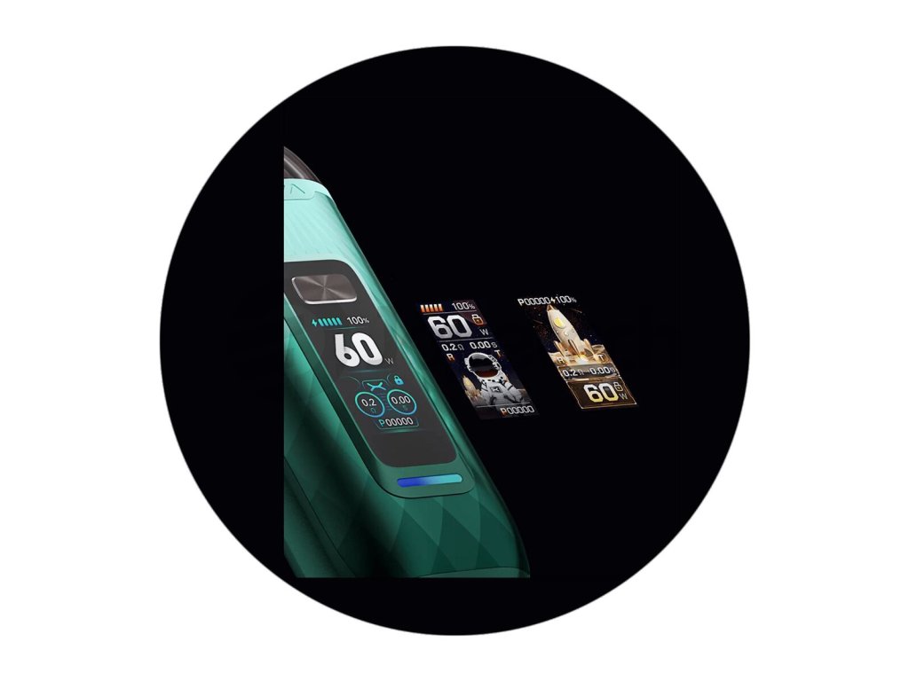 Přední panel zdobí mohutný celobarevný displej, který vás bude během používání neustále informovat o všech parametrech a aktuálním stavu baterie. Všechny položky jsou krásně čitelné a jedním pohledem si vždy snadno ověříte, jaký máte nastavený výkon, jaký je odpor cartridge, kolik máte odvapováno potahů nebo zda není e-cigareta uzamčená. Vše potom doplní krásné barevné animace zobrazené na displeji během potahu pro vizuální požitek při vapování.