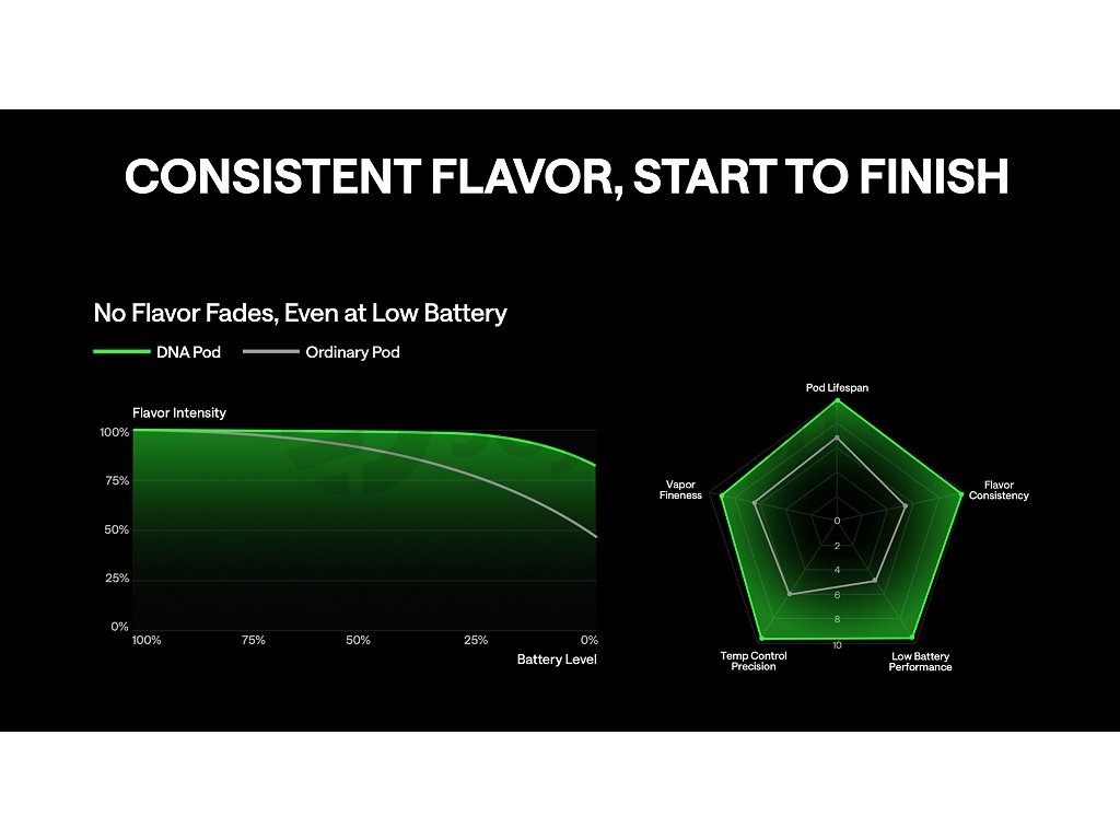 Výkonná baterieIntegrovaná baterie o kapacitě 1300 mAh s pokročilým power managementem DNA čipsetu pro delší výdrž oproti konvenčním pod systémům. Efektivní využití energie zajišťuje hladký provoz a spolehlivý výkon po celou dobu používání elektronické cigarety. |