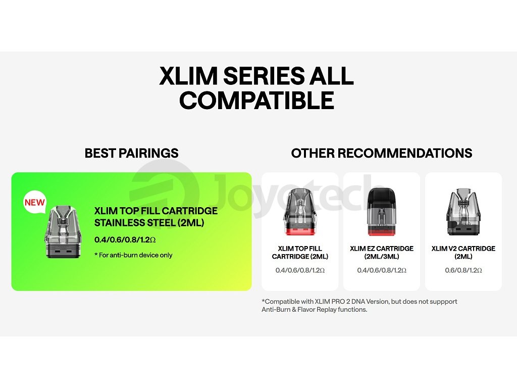 Xlim SS cartridgeNové Xlim Top Fill SS cartridge s mesh pletivem z nerezové oceli pro výrazně lepší chuťový zážitek a plnou kompatibilitu s teplotní kontrolou. Objem 2ml s top fill plněním a magnetické uchycení pro maximální pohodlí používání a údržby. |