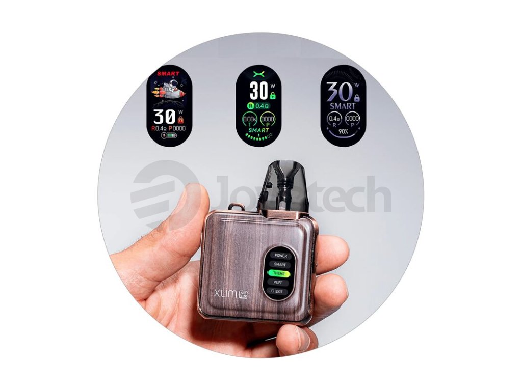 Boční část disponuje krásným barevným TFT displejem, na kterém budete mít neustálý přehled o nastavených parametrech, nebo o počtu potahů, nastaveném výkonu a stavu baterie. Xlim SQ Pro nabídne také přehledné uživatelské rozhraní a velice snadné ovládání, v nabídce na displeji se pohybujete pomocí jednoho tlačítka, vše máte nastaveno a upraveno během pár vteřin. E-cigareta umožňuje regulaci výkonu v rozpětí 5 - 30 W a volbu výstupního režimu mezi režimem Power, nebo režimem Smart. Mimo tyto funkce nabídne také hned tři hlavní uživatelská témata, můžete tak vybírat z konvenčnějších grafických rozhraní, nebo z těch odvážnějších. Samozřejmostí jsou potom také dvě metody spínání potahu, nebo praktická manuální regulace airflow. Nesmí chybět ani kompatibilita s kompletní platformou cartridgí Xlim Pod. Osvědčené cartridge Xlim V3 Top Fill najdete také v základním balení, postarají se o mimořádný chuťový zážitek a ještě umocní celkové kvality zařízení SQ Pro. Model OXVA Xlim SQ Pro Pod je určen všem milovníkům MTL šlukování, kteří se poohlíží po velice stylovém zařízení nabitém funkcemi a s jedinečným zpracovaním.