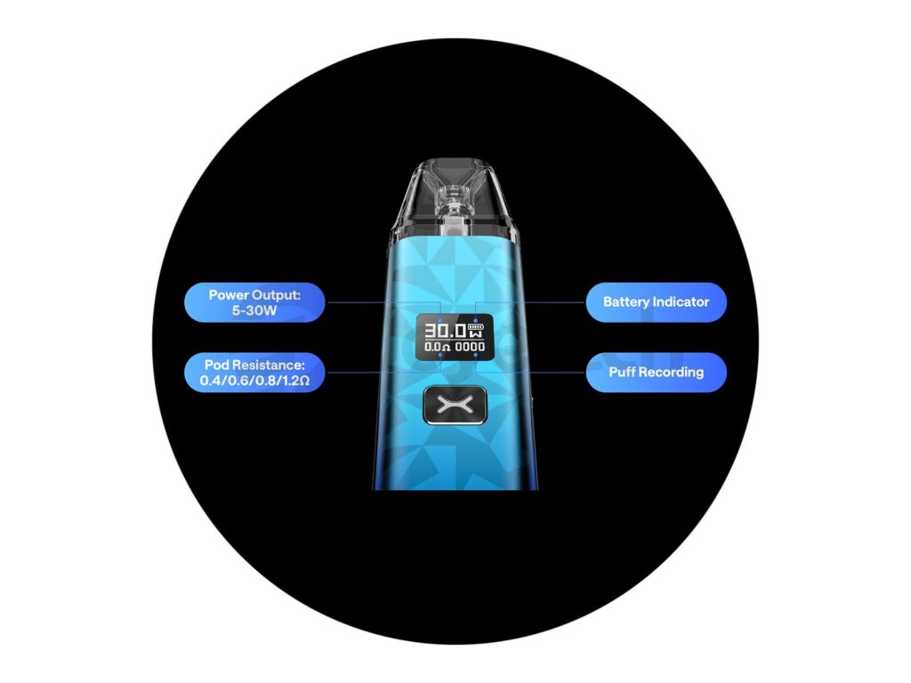 * Zařízení disponuje funkcí inteligentní detekce odporu, po připojení cartridge omezí nastavitelný rozsah výkonu podle odporu připojené cartridge. Výkon 30W lze používat s cartridgí Xlim V3 0.4Ω, která není součástí základního balení.